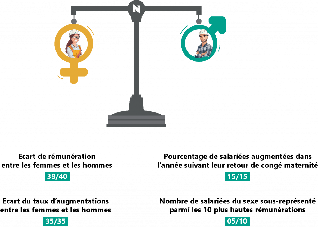 Au titre de l’année 2025, nous avons obtenu la note de 93/100 pour l’index d’égalité professionnelle, résultant d’indicateurs relatifs aux écarts de rémunération entre les femmes et les hommes. Il se base sur les 4 indicateurs ci-dessous :